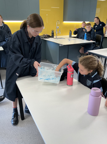 Excitement levels were high as the day arrived and so did the Year 3 students from SJSR. Demonstrations were held both outdoors and indoors, with the Year 8 students sharing information about the experiments as they were carrying them out, asking for input from the Year 3 students predicting what may happen such as “what do you think is going to happen when I pour the vinegar into the bicarb soda?”, “once the mentos falls into the bottle of Coke, do you think there will be a chemical or physical reaction?” and “why do you think the egg shell breaks away after sitting in the vinegar for days?”. Many hands were raised when helpers were required, engaging the younger students in the hands-on steps of the experiments. Explosions, erupting volcanos and big bangs from the Glow in the Dark Volcano, Exploding Bags, Balloon Pop/Not, Elephant Toothpaste and Mentos and Coke experiments were met with gasps and shrieks of surprise and joy! Another popular element of the showcase was sharing the outcome of some of the experiments that students were able to touch and try. This included students feeling the textures of Snow Fluff and Oobleck, and the sensation in their mouths of the Orange Fizz experiment. Other experiments shared, included storm in a glass, surface tension art, tie dye milk, burning cups, flying teabags, balloon rockets and water fireworks. Following the experiments, the students evaluated the outcomes of the experiments as a group, discussing why things did or didn’t happen.